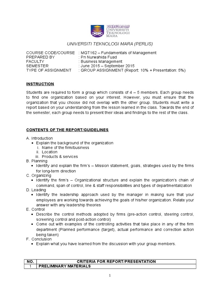 Assignment Mgt162 Universiti Teknologi Mara Cawangan Kedah Mgt 162 Fundamentals Of Management Nama Studocu